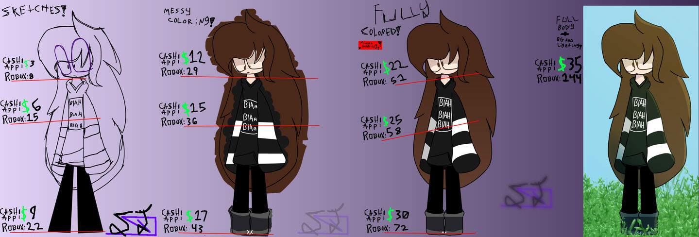 Heya, thanks for checking me out! I'm someone who's been looking into doing commissions for a while! Thanks for checking me out!At the moment, I only take ROBUX, Discord Nitro, and Cash App! My apologies!